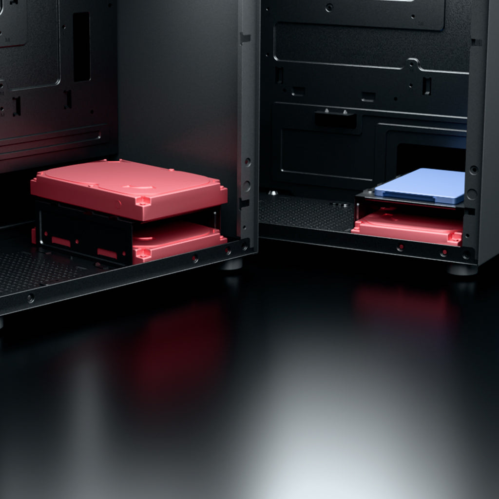 Tailor your storage setup with two versatile configurations:  2 HDDs and 1 HDD + 1 SSD ensuring maximum flexibility.