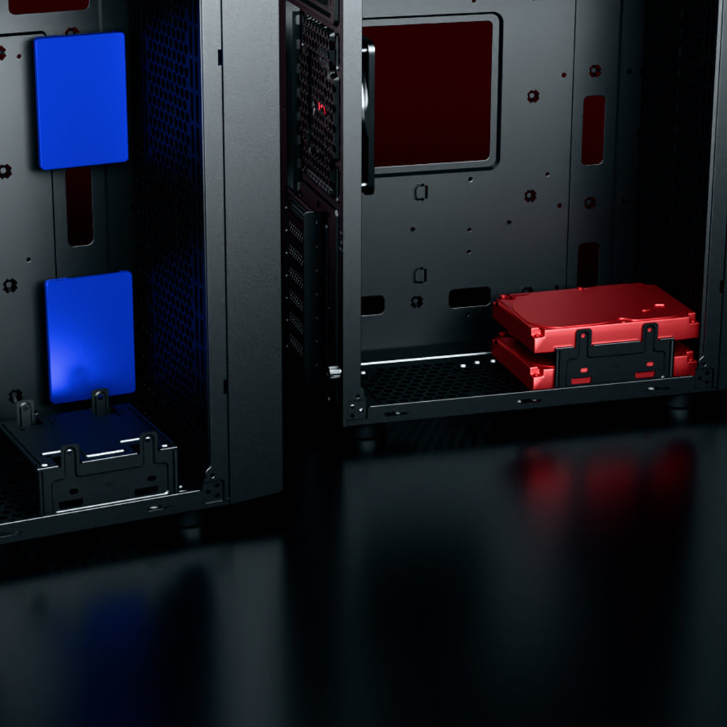 The chassis offers flexible storage options with 2 configurations -1 HDD + 3 SSDs and 2 HDDs + 2 SSDs ensuring flexibility.