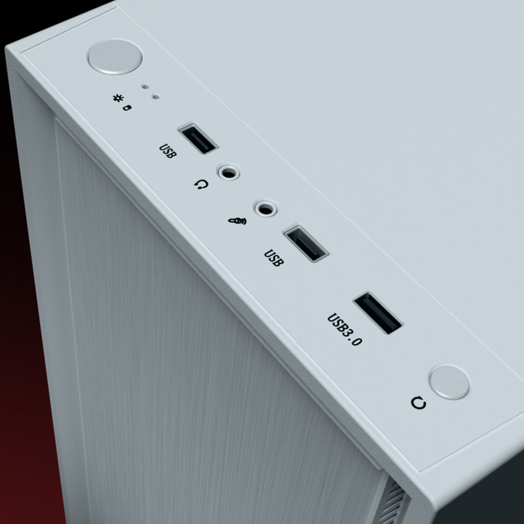 This chassis includes a USB 3.0 port for fast data transfers, 2x USB ports for peripherals, and dedicated headphone and microphone jacks for seamless audio connectivity.