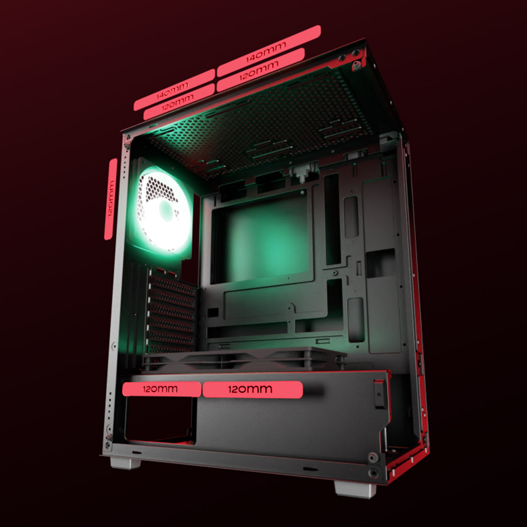 Equipped with 3x120mm fans—one at the rear and two at the bottom and space to host more fans for efficient cooling.