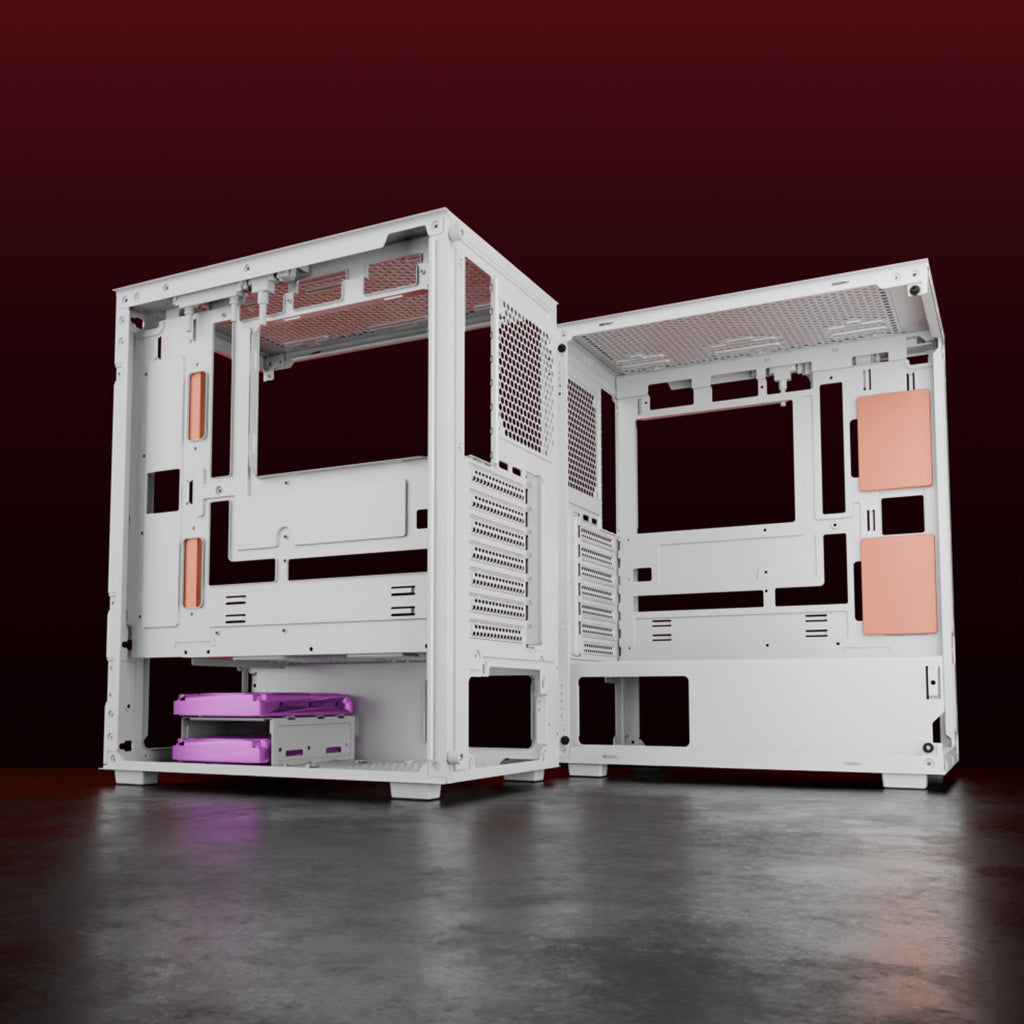 Supports a 200mm bottom-mounted PSU for peak performance, with top and bottom filters ensuring clean airflow. The wrap-around tempered glass offers a stunning panoramic view.