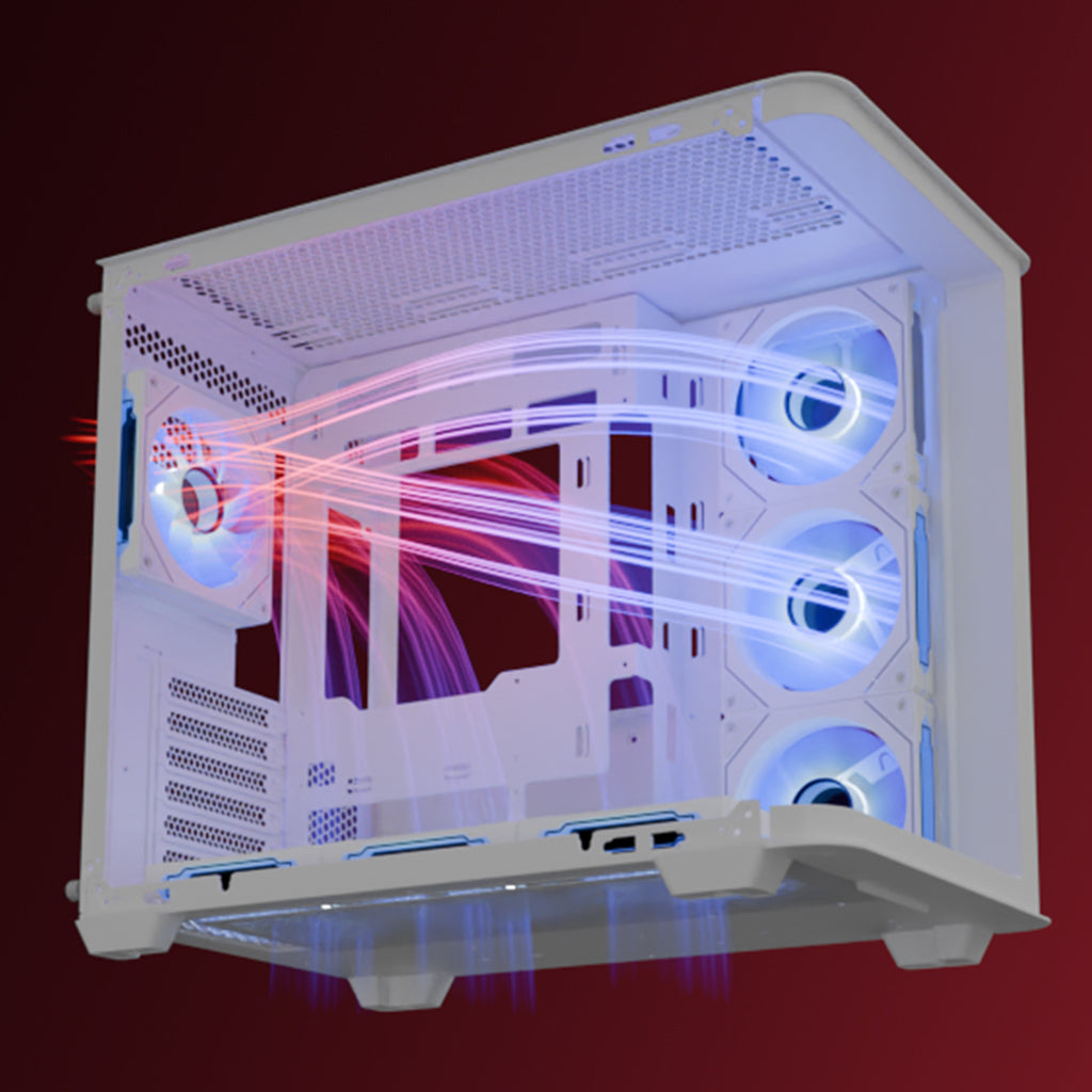 Equipped with 7 x 120mm hexa pattern fans—1 at the rear, 3 reverse-blade fans at the bottom, and 3 reverse-blade fans at the sides—this chassis features center and side infinity mirror-glow ARGB fans, delivering brilliant illumination and superior cooling for an immersive gaming experience.