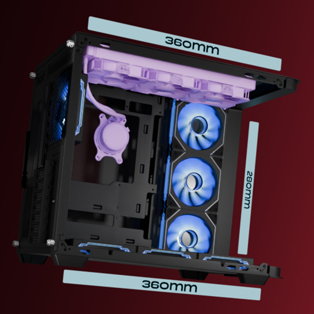 Supports AIO coolers up to 360mm on the top, 360mm on the bottom, and 280mm on the side, ensuring superior cooling and maximum performance!