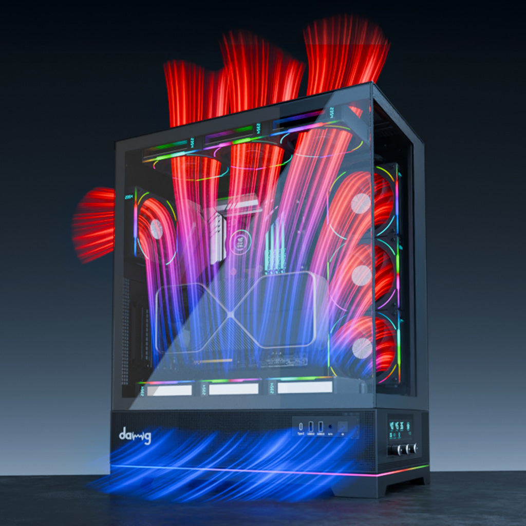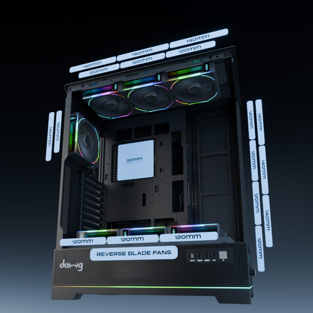 Equipped with 10 x 120mm hexa pattern fans—1 at the rear, 3 at the top, 3 reverse-blade fans at the bottom, and 3 fans on the side along with built-in AIO, this chassis features center and side infinity mirror-glow ARGB fans, delivering brilliant illumination and superior cooling for immersive gaming experience.