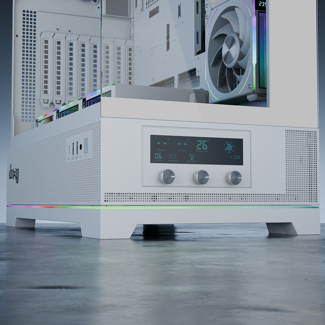 Showcase your build with a wrap-around tempered glass panel, a 250mm bottom-mounted PSU chamber, and smart RPM indicator fans up to 2600 RPM. Top and bottom dust filters enhance airflow for peak performance.