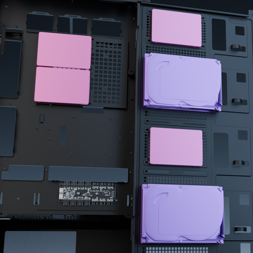 Tailor your storage layout with 2 configurations: ( HDD x 1 / SSD x 2 ) + HDD x 2 + SSD x 2 and ( HDD x 1 / SSD x 2 ) + HDD x 3 + SSD x 1for maximum flexibility.